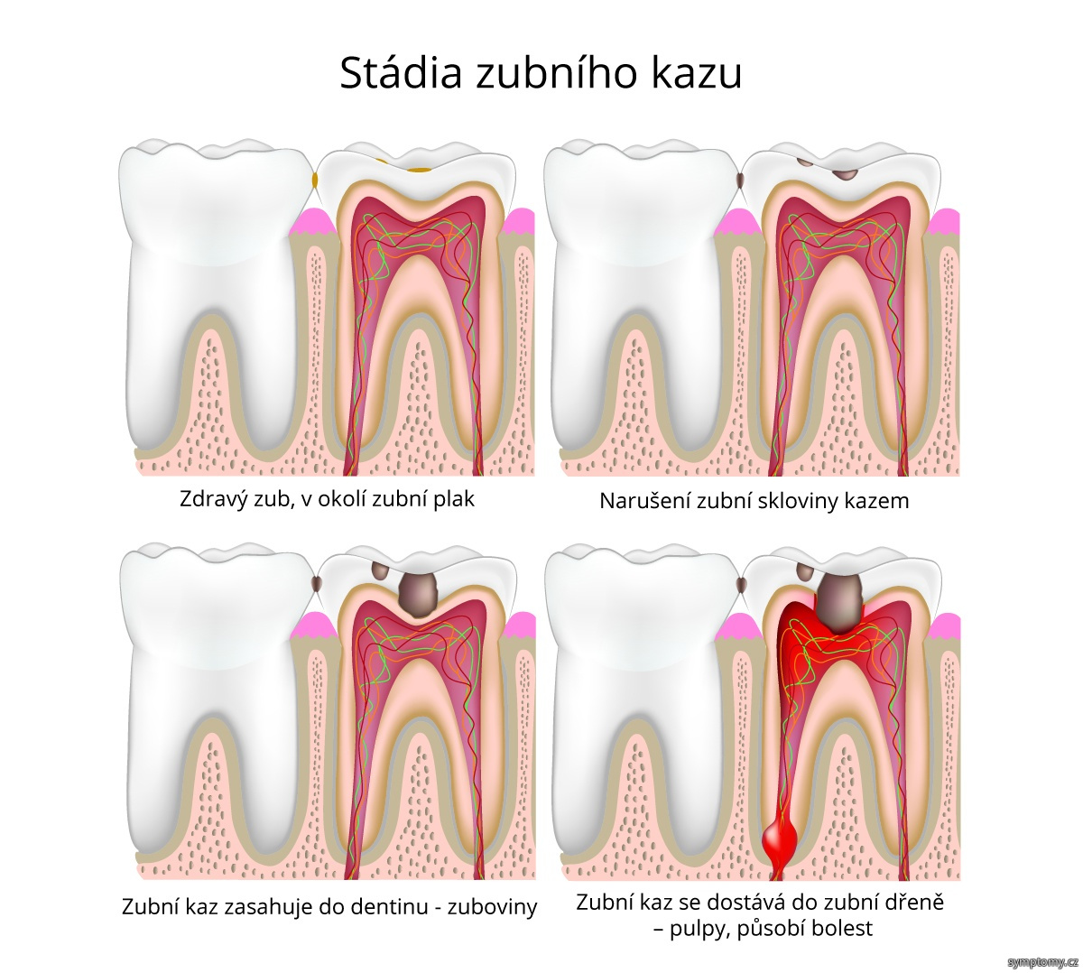 Zubní kaz se postupně dostává do vnitřních částí celého zubu. Sami jej poznáte, pokud vás budou zuby bolet při teplých, studených, sladkých a slaných jídlech nebo nápojích - objevuje se ostrá chvilková bolest. Při větších potížích se bolest stupňuje, trvá déle a zub může být citlivý už jen na dotek jazykem či potravou.